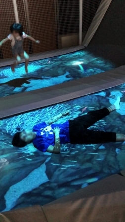 1→10の「スマッチ」を活用してトランポリンに南国を想像させる海面をプロジェクションし、お魚たちが優雅に泳ぐ海の上を飛び跳ねるような体験を作り上げました。ジャンプする度に「ザバーン」という音と共に水しぶきが上がり、クジラ、サメ、タコなど様々な生き物が泳ぎ回ります。
