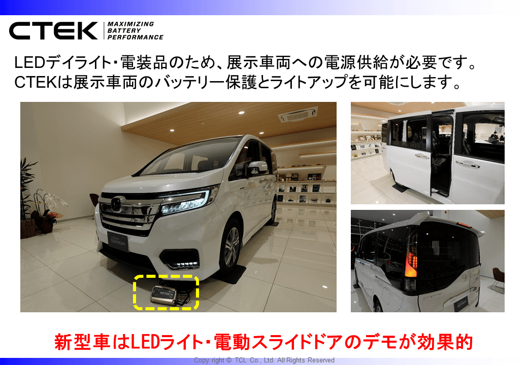 CTEK MXS25ECは車両プログラミング時の電源としても使用できる高品質な電源機能も持っているため、ディーラー店舗でのLEDライト・液晶メーター・パワーシートのデモもバッテリー上がりを気にせず使用することが出来ます。