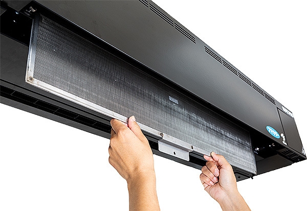 忌避剤の吹出口から吹き出された忌避成分がエアカーテンの気流にのりドア開口部に行き渡り防虫します。無煙・無臭の安全な薬剤を使用し、施設内への虫の侵入を防ぎます。
