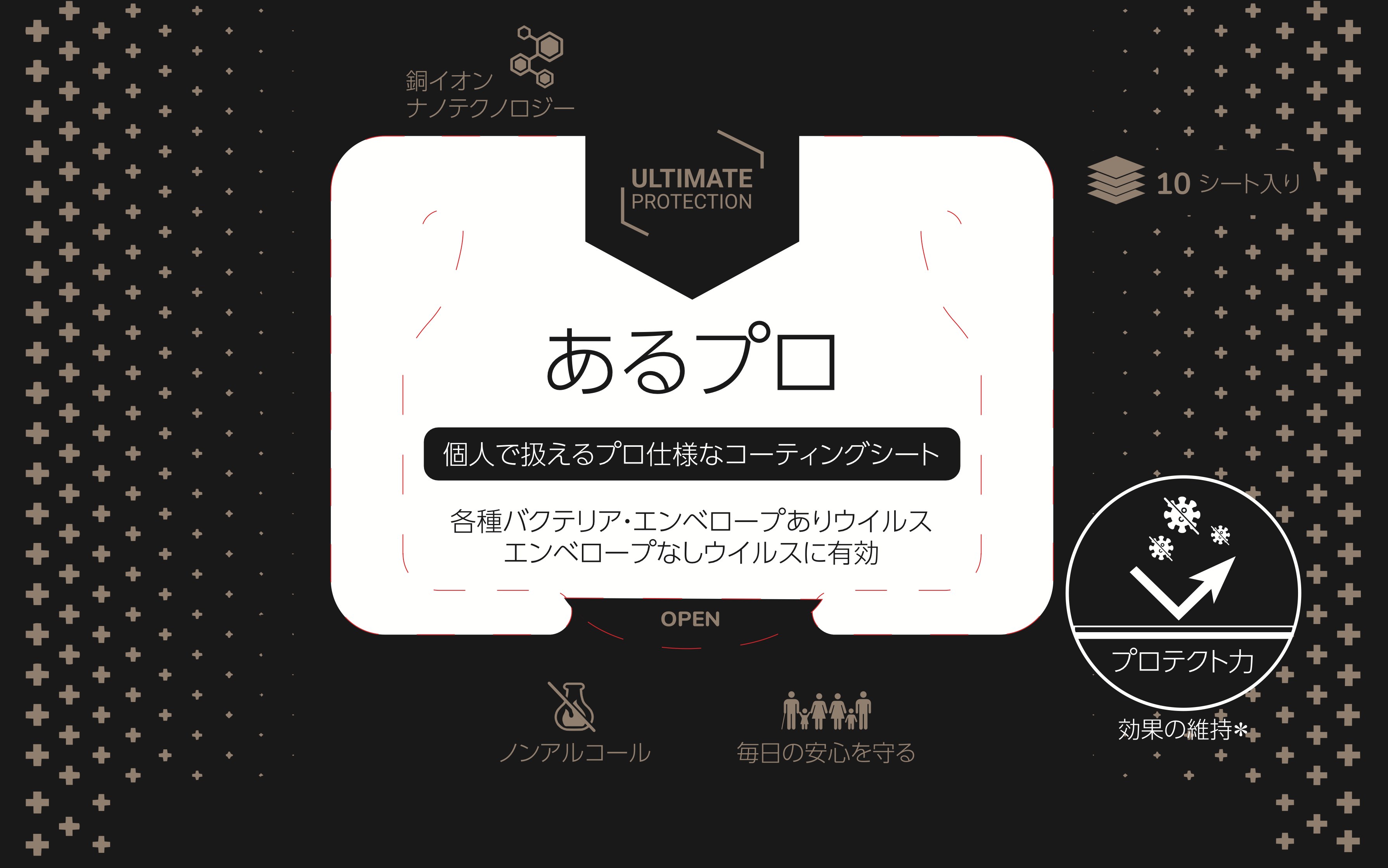 シンガポールNEA公表リストではNANOSHIELDとしてリストアップされており、日本では「ULTIMATE PROTECTION」または「あるプロ」として主に介護業界へ展開されています。個人で扱えるプロ仕様なコーティングシートで任意の範囲内で衛生環境を整える事が可能です。即効性と持続性を兼ね備えた機能性コーティングです。
