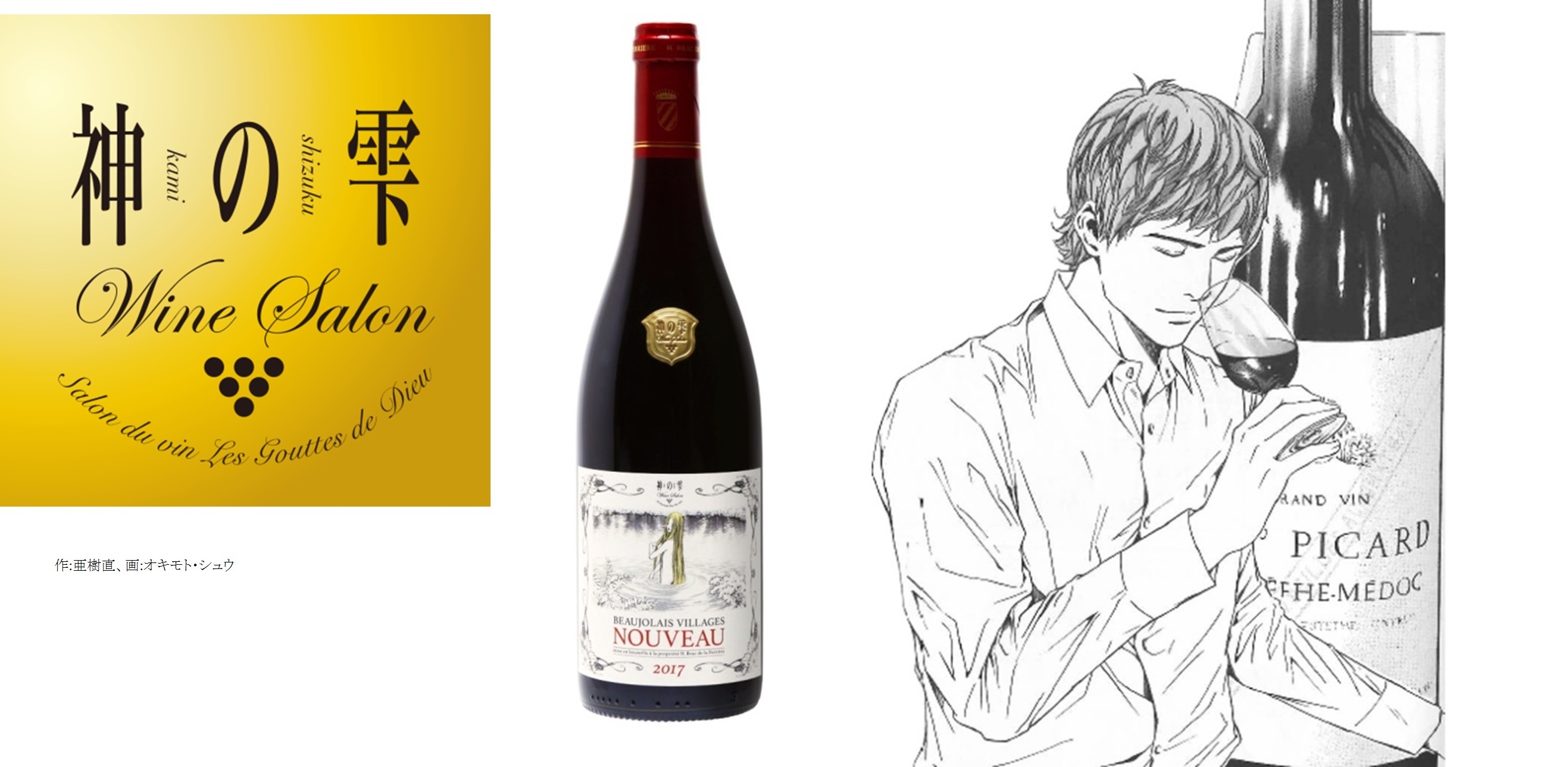 累計1,000万部突破したワイン漫画「神の雫」 原作者・亜樹直氏監修の 「ボジョレーヴィラージュヌーヴォー」(限定600本) ヌーヴォー特有の甘みとフレッシュさをイメージした エチケットデザイン ワインと食のキュレーションコマースサイト 「神の雫ワインサロン」で9月11日予約受付開始!