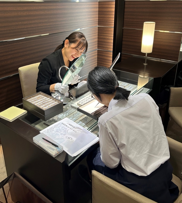 社会人としての基本的なマナーを学ぶことや、接客体験を行ったほか、当社ならではの体験として、パーソナルハンド診断(R)を受けていただき、自分に似合うリングや好きなリングに出会ってもらいました。ダイヤモンドについても、実際に触れてその美しさや大きさに驚きながらも、楽しんで学んでいただけました。