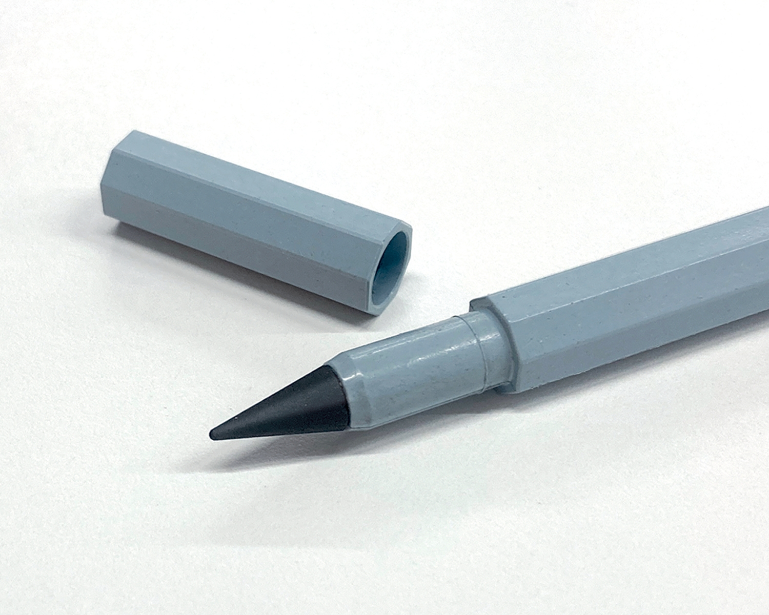 芯が黒鉛と金属を含んだ特殊芯で作られており、筆記時に紙との摩擦で生じる黒鉛と金属の粒子が紙に付着することで筆跡となる、鉛筆のようで鉛筆とは違う、新しい筆記具です。芯は約2H鉛筆相当の濃さになります。(※当社比。紙の種類によって濃さが変わります。)