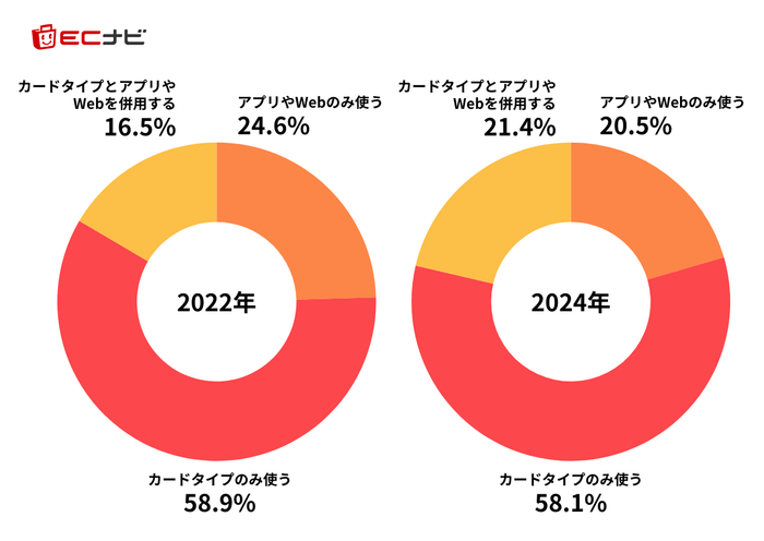ここ半年以内にデジタルではない物理的なポイントカードを利用したかを聞いてみると、2割以上が「カードタイプは使わない」と回答しました。また、2022年に同社が実施した同様の調査データと比較すると、「カードタイプのみを使う」と答えた人は24.6%から20.4%と4.2pt減り、一方で「カードタイプは使わない」と答えた人は16.5%から21.4%と4.9pt増えており、徐々に物理的なポイントカードからデジタルへ移行していることが分かりました。
