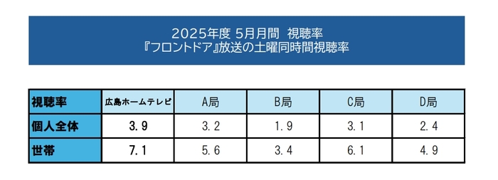 「フロントドア」2025年5月月間視聴率 同時間帯1位を獲得!【広島ホームテレビ】
