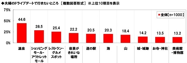 次に、【夫婦のドライブデートで行きたいところ】を聞いたところ、「温泉」が最も多く44.6%、次いで、「ショッピングモール・アウトレットモール」が28.5%、「レストラン・グルメスポット」が25.4%、「夜景がきれいな場所」が22.2%、「道の駅」が20.5%で続きました。夫婦二人きりで温泉でのんびりしたいと思っている夫婦、お買い物やグルメをドライブ先で楽しみたいと思っている夫婦、きれいな夜景を見てロマンチックに過ごしたい夫婦が多いようです。