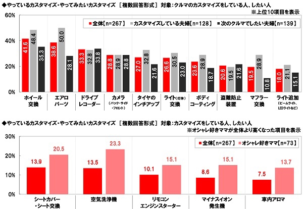 現在のクルマをカスタマイズしている夫婦(128名)と次のクルマでカスタマイズしたいと思っている夫婦(139名)に、現在やっているカスタマイズ・やってみたいカスタマイズを聞いたところ、1位は「ホイール交換」で41.6%、2位は「エアロパーツ」で38.6%、3位は「ドライブレコーダー」で33.3%、4位「カメラ(バック・サイド・フロント)」28.8%、5位「タイヤのインチアップ」27.0%となりました。クルマをスタイリッシュにする足廻りや外装・エクステリアのカスタマイズ、安全装備のカスタマイズが人気のようです。