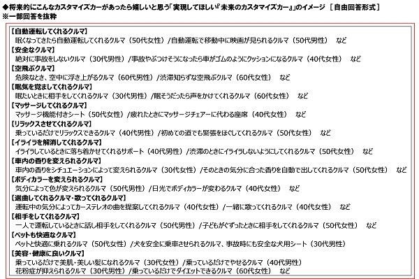 さらに、全回答者(1,000名)に、将来的にこんなカスタマイズカーがあったら嬉しいと思う「実現してほしい『未来のカスタマイズカー』」のイメージを聞いたところ、「自動運転してくれるクルマ」や「安全なクルマ」、「空飛ぶクルマ」が多数挙げられました。