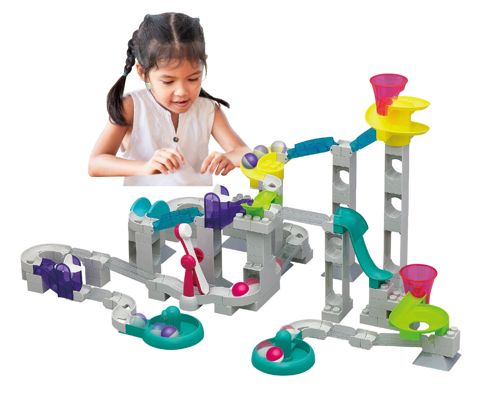 1.5歳から安心して遊べる大きなパーツを採用することで誤飲の心配もありません。また、新たに追加した特許出願中のフレキシブルレールにより、多様なコース作成が可能。レール部分が自由に動き、段差を気にせず連結が可能となりました。基本コースのスロープトイからのプログラミング的思考を育む複雑なコースまで作ることができ長く楽しめるおもちゃです。