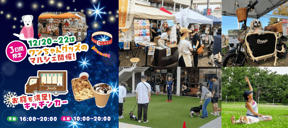 ワンちゃんのフードやグッズ、アパレルやワンちゃんと乗れる電動バイク、さらにTV東京のTVチャンピオン優勝者の金倉高志先生によるしつけ方教室やドッグヨガ、プロカメラマンによる撮影会など個性豊かな22店舗が集まるドッグマルシェを12/20(金)~12/22(日)までの3日間開催します。またキッチンカーエリアでは暖かいフードやドリンクメニューをご用意してみなさまのご来場をお待ちしております。