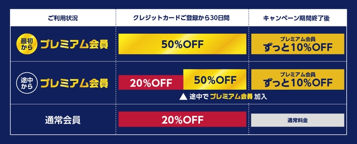 クレジットカード登録30日間キャンペーンの割引率が、通常20%OFFのところプレミアム会員の場合50%OFFになります。