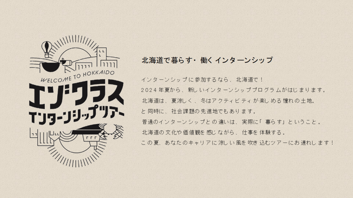株式会社サッポロドラッグストアー(本社:札幌市東区/代表取締役社長 CEO 富山 浩樹)が運営するEZOHUB TOKYO(2024年5月29日オープン/東京都品川区東品川2-2-28)は、首都圏の学生と北海道内企業を結び、北海道で行う学生インターンシップ「エゾクラスインターンシップツアー」を2024年8月から11月2日まで開催したことをお知らせいたします。