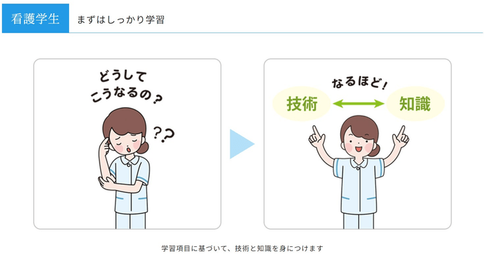 そして、本サービスは看護学生・教員・教務主任、それぞれの立場で役立つように設計されており、看護学生にはしっかりした学習をサポート、教員へは学生の指導に役立てられるように設計、そして教務主任の皆さまには安心して授業を行っていただけるようなコンテンツとなっております。