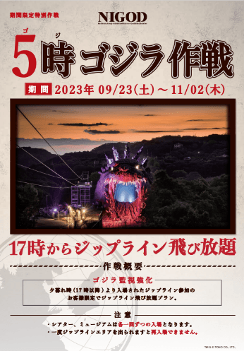 「ゴジラ迎撃作戦」をもっと楽しめる夜の企画が復活! ジップライン飛び放題『5 時ゴジラ作戦』 を 9 月 23 日より開始