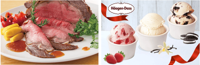 右:ホテルニュー塩原もハーゲンダッツアイスクリームが食べ放題!人気のバニラ、ストロベリーとクッキー&クリームの3種類をご用意いたしました。好きなだけスクープして、何度でもおかわりができるのはバイキングならではの醍醐味。