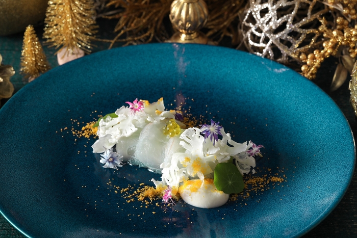 伊勢真鯛とカリフラワーのインサラータ ポロ葱のサルターレ カラスミの香り