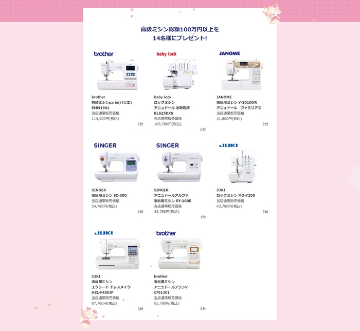 本キャンペーンは、レッスンバッグやスモック、上履き入れほか、お子様の入園や入学の際に必要なグッズを手作りしてSNSに写真を投稿すると、14名のお客様に、刺繍ミシンやロックミシンなど総額100万円以上の豪華なミシンをプレゼントするSNS投稿キャンペーンです。