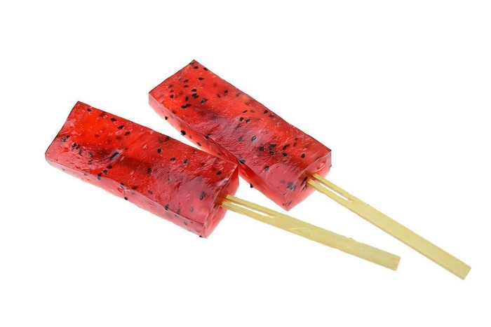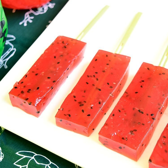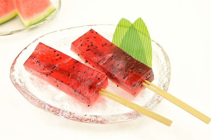 透きとおる赤いわらび餅にすいかの種をイメージして入れた黒ゴマ、一口頬張るとプルプルもちもちとした食感にすっきりと甘いすいか味のわらび餅。一本一本食べやすいように串に刺してあるので、アイスキャンディーのように片手で美味しくいただくことができます。よく冷やして暑い夏においしさを楽しめる一品に仕上がりました。