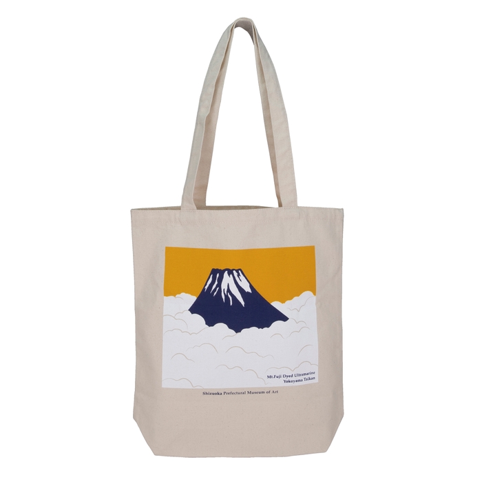 大正から昭和にかけて多くの富士図を描いている横山大観。なかでも静岡県立美術館所蔵の《群青富士》は、簡潔な構図のうちに、躍動感と装飾性を示す近代的な富士図として、一際高い評価を受けています。金地に山肌の群青と残雪や雲の白が生える、美しい作品を、シルク印刷3色で表現しました。特に湧き立つ白雲の再現にこだわり、作品から受ける清々しい初夏の富士の印象を大切にしました。美術館観覧、そして静岡旅のお土産にもぴったりのトートバッグです。