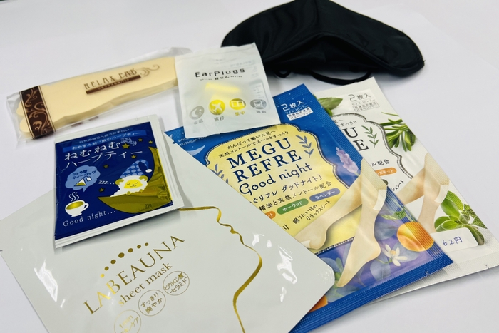 チェックイン時に、足裏シート、フェイスマスク、アイマスク、耳栓、ナイトチョコ(GABA)、安眠効果ハーブティ、リラックス足指パッドの中から1点をお選びいただけます。これらのアメニティは、宿泊者がリラックスしやすい環境を整えるために用意されています。
