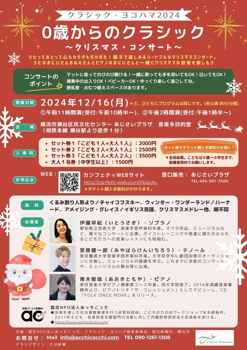 認定NPO法人あっちこっち、クラシック・ヨコハマ推委員会、毎日新聞社、横浜市主催、『0歳からのクラシック~クリスマス・コンサート』が2024年12月16日 (月)に横浜市瀬谷区民文化センター あじさいプラザ 音楽多目的室(神奈川県 横浜市瀬谷区 瀬谷 4丁目4番地10(ライブゲート瀬谷3階・4階))にて開催されます。