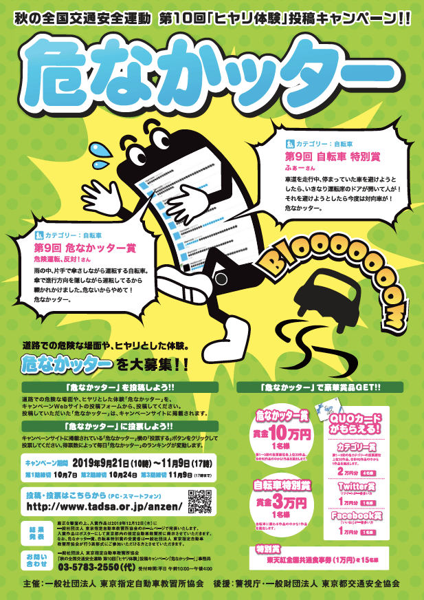 一般社団法人 東京指定自動車教習所協会(本部:東京都品川区、以下 東京指定自動車教習所協会)は、警視庁、一般財団法人 東京都交通安全協会の後援を受け、「秋の全国交通安全運動」の一環として道路での危険な場面やヒヤリとした体験を投稿・投票する“秋の全国交通安全運動 第10回「ヒヤリ体験」投稿キャンペーン!!『危なかッター』”を、2019年9月21日(土)から開始いたしました。