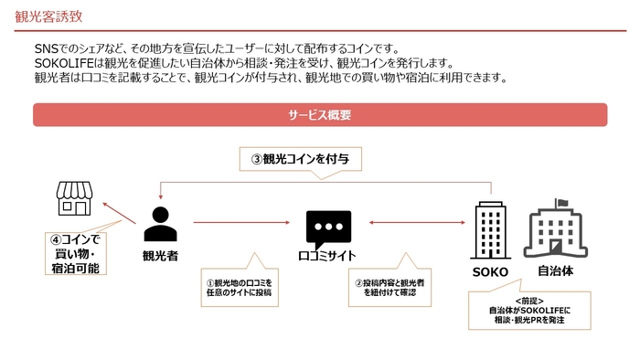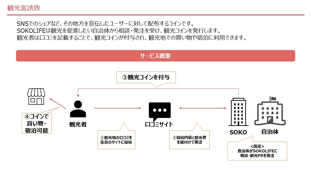 具体的には、SNS や旅行サイトにて、対象自治体の口コミを投稿してくれた方々にコインを配布することで、観光に繋げていきます。