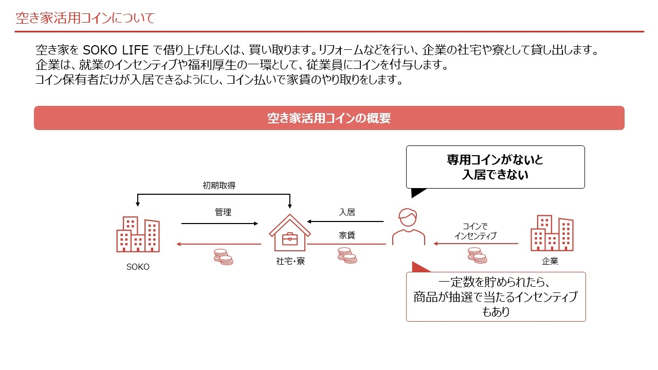 空き家を SOKO LIFE TECHNOLOGY にて、買い取り、もしくは借り上げを行い、企業の寮や社宅として貸し出します。