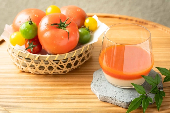 温泉とトマトで心と身体を癒す至福の滞在は「トマト宝石重」から始まります。湯浴み前の水分と糖分補給としてスタッフ厳選の色鮮やかなトマトとスイーツを用意しています。彩り豊かで見た目にも美しく、食感や味の違いを楽しめるのはもちろんのこと、トマト嫌いでも食べられるほど糖度の高い品種も含まれています。