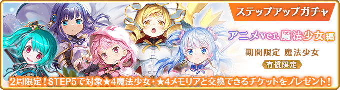また、本ガチャの開催と合わせて、『期間限定 アニメver.魔法少女 ピックアップガチャ』をお得に引ける、『有償限定 ステップアップガチャ アニメver.魔法少女編』を開始いたしました。