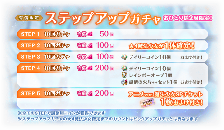 ※本ガチャで獲得した「調整屋コイン」は、同時開催の『有償限定 ステップアップガチャ アニメver.魔法少女編』で入手可能な「調整屋コイン」と共通のショップで使用できます。