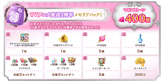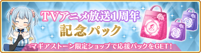 ※「TVアニメ放送1周年記念パック」「TVアニメ放送1周年記念メモリアパックⅠ」「TVアニメ放送1周年記念メモリアパックⅡ」のご購入はおひとり様1回までです。