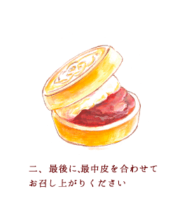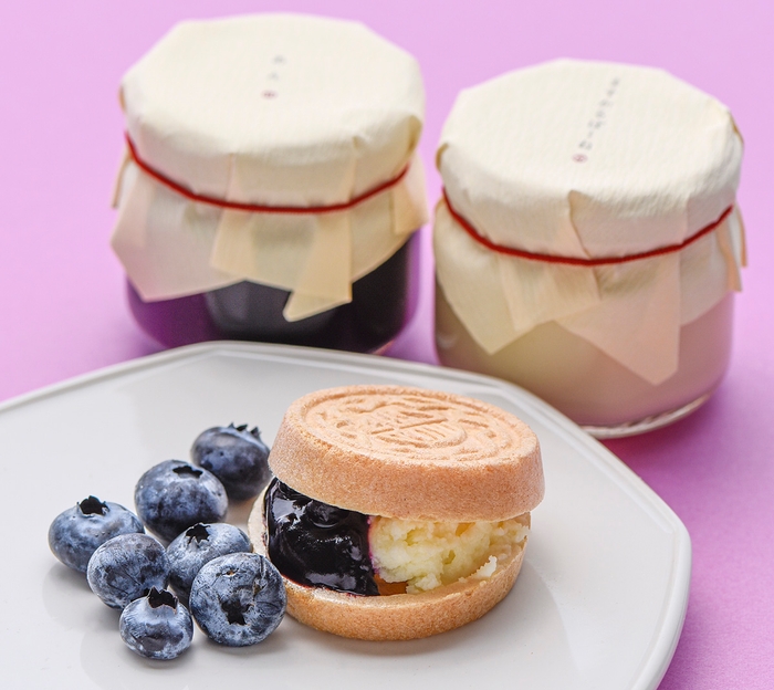 ブルーベリーを練り込んだあんことマスカルポーネチーズを使った自家製クリームを歯切れの良い最中皮に、お好みでサンドしていただく一品です。