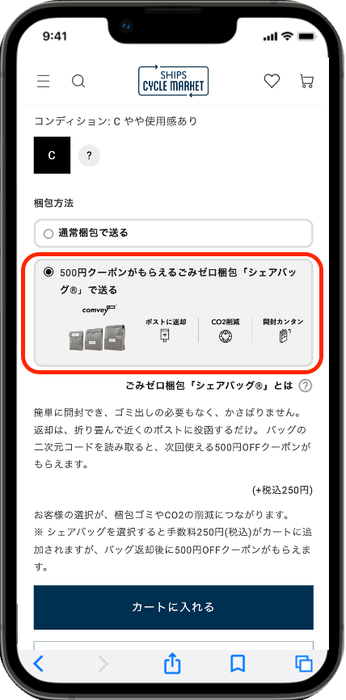 「SHIPS CYCLE MARKET」で商品ページの「梱包方法」でシェアバッグを選択すると、商品がシェアバッグで届きます。シェアバッグを選んだお客様は、ゴミやCO2排出量の削減に貢献できるだけでなく、梱包ストレス(※)を軽減したり、「SHIPS CYCLE MARKET」で次回ご注文に使える500円OFFクーポンを獲得できます。