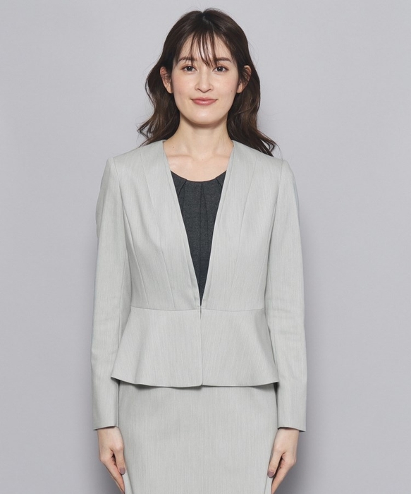 ウエストから裾にかけての柔らかく、女性らしいペプラムシルエットと細く繊細な二枚重ねの切り替えラインに拘ったジャケットに仕上げました。