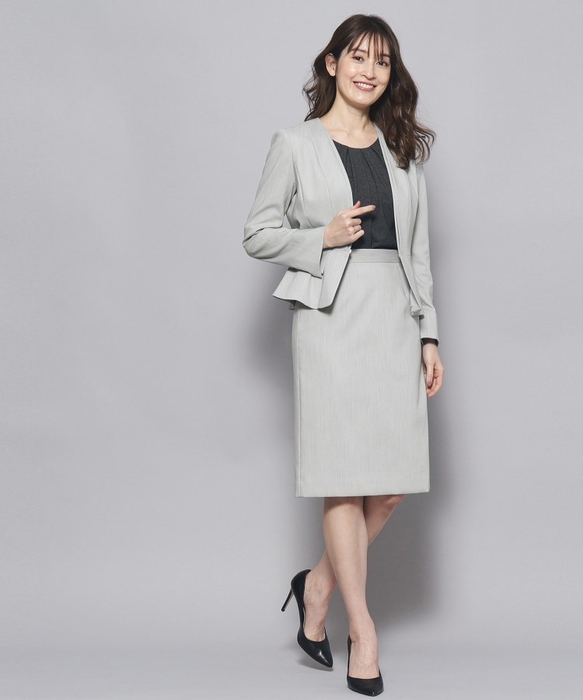 ウエストから裾にかけてペプラムラインにし、女性らしい華やかなシルエットを実現。またウエスト切り替え位置を高めに入れることで、細見えと脚長効果が期待できます。