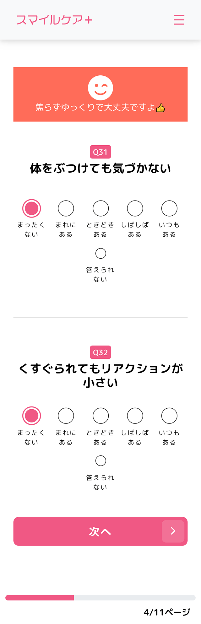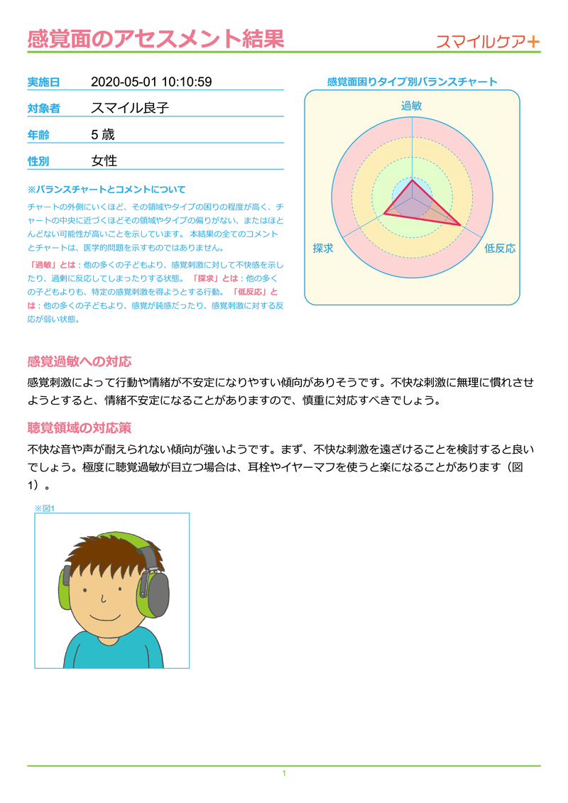 感覚の困りや不器用さの研究の第一人者、岩永 竜一郎・長崎大学大学院教授が考案した診断システム。「食べ物でないものを口にもっていく?」「はみ出さないように塗り絵ができる?」などの一連の質問に5段階評価で答えるだけで、視覚や聴覚などの困りや、運動の不器用さをグラフとコメントでレポートします。