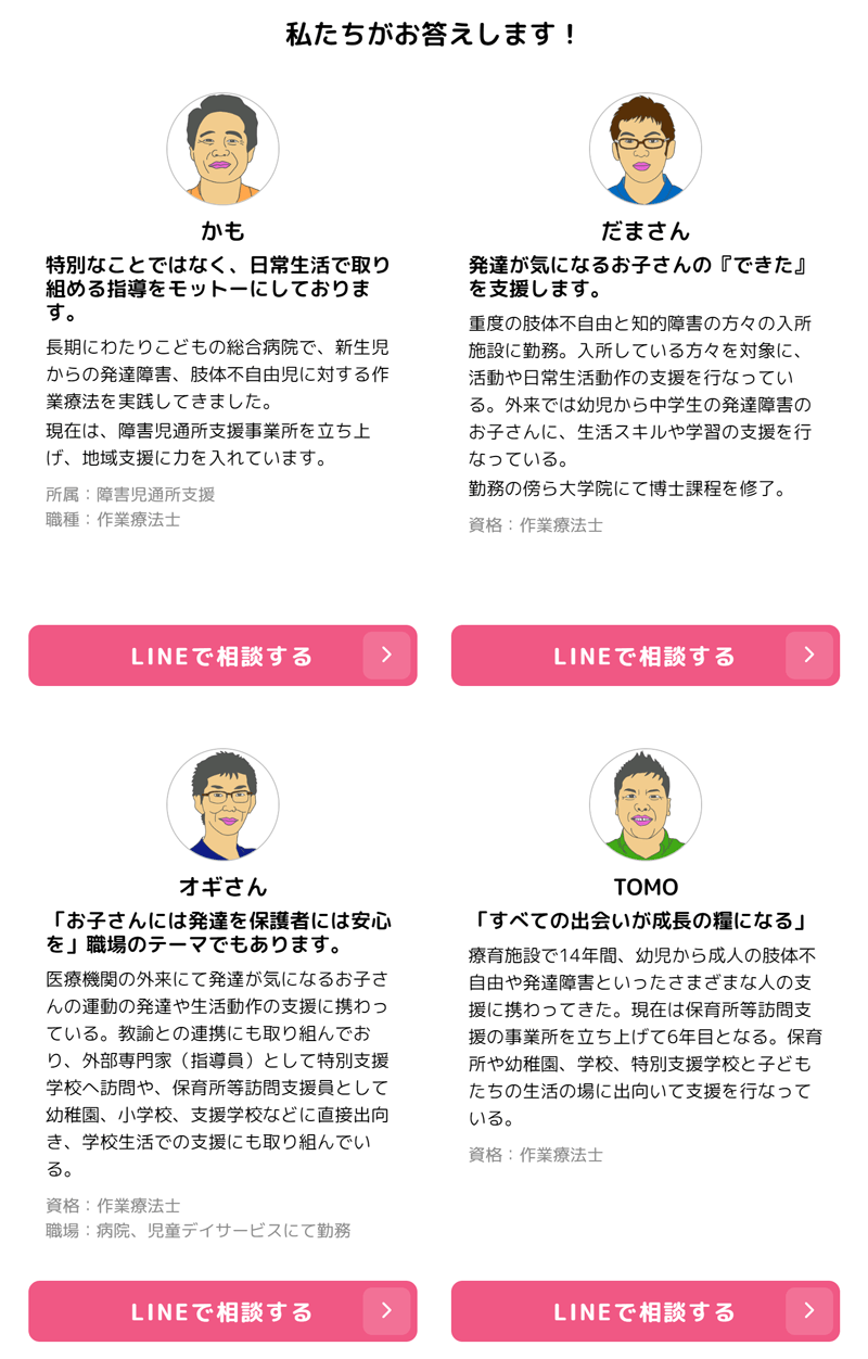 よくできた発達支援プログラムであっても、クリアできない場面や段階が出てくるものです。そんな時に役立つのがこのサービス。4人の専門家のプロフィールを見て一人を選び、いつでもLINEで相談することができます。