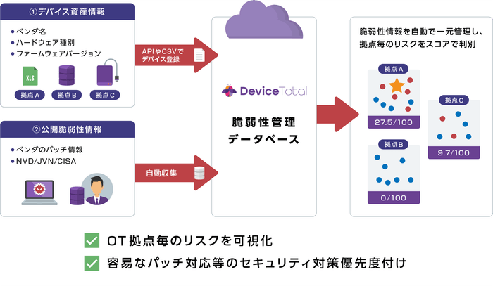 DeviceTotalは、ユーザーが把握しているOT/IoT/ネットワークデバイスの「ベンダ名・ハードウェア種別・ファームウェアバージョン」の3種類の情報をAPIやCSVファイルで登録するだけで、脆弱性などのリスクを可視化できるプラットフォームです。デバイス単位だけでなく、拠点や組織単位でリスクをスコアリングすることで組織が潜在的に抱えるリスクを容易に可視化し、組織全体の継続的なセキュリティリスク管理を実現します。これにより、優先してパッチ適用などの対処をすべきデバイスや拠点を把握することができ、少ない工数で効率的にデバイスのセキュリティ対策が可能です。
