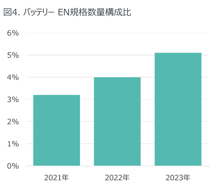 自動車用バッテリーのサイズ構成をみると、最も販売の多いB19の数量構成比は29%に縮小した。その一方でD26が数量構成比を12%へと拡大させており、数量前年比では16%増、特にインターネットでは36%増と著しい伸長が見られた。また、近年国産車でも採用車種が広がっているEN規格バッテリーは全体で数量前年比29%増と顕著な伸長を示した。数量構成比では前年の4%から5%に増加し(図4)、インターネットでは9%を占めるに至った。