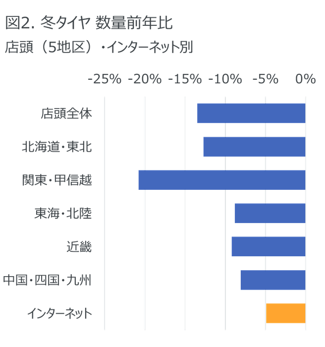 冬タイヤの2023年9-12月期の数量前年比は全体で10%減と二桁マイナスとなった。店頭では数量前年比14%減、特に関東・甲信越では同21%減と前年を大幅に割り込み、インターネットでは同5%減であった(図2)。冬タイヤの最盛期である12月の販売が、数量前年比25%減と著しく減少したことが影響した。冬タイヤの平均価格は店頭では13,123円と前年から7%上昇したことに対し、インターネットではプレミアム製品の構成比が下がったことが一因となり、11,682円と1%下落した。金額前年比は店頭では8%減、インターネットでは2%減となった。
