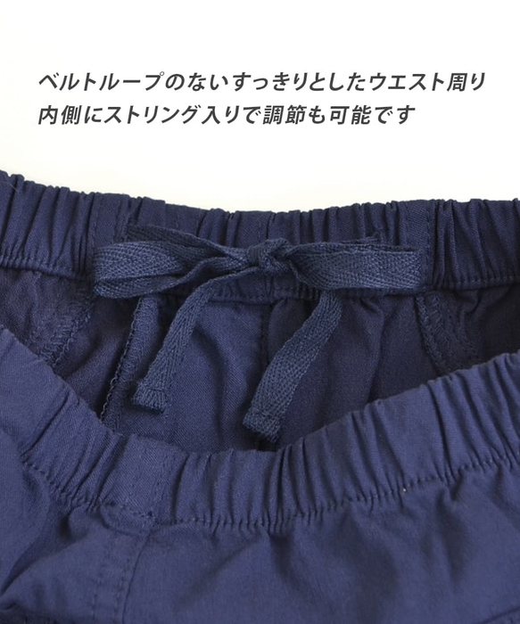 また、前開きとポケットはフェイクステッチにし、ベルトループを無くしたシンプルな作りにすることでトップスやワンピースを重ねた時に腰回りがごわつきにくくしています。ウエストには内側に紐を入れており、ベルトループなしでも調節していただけます。