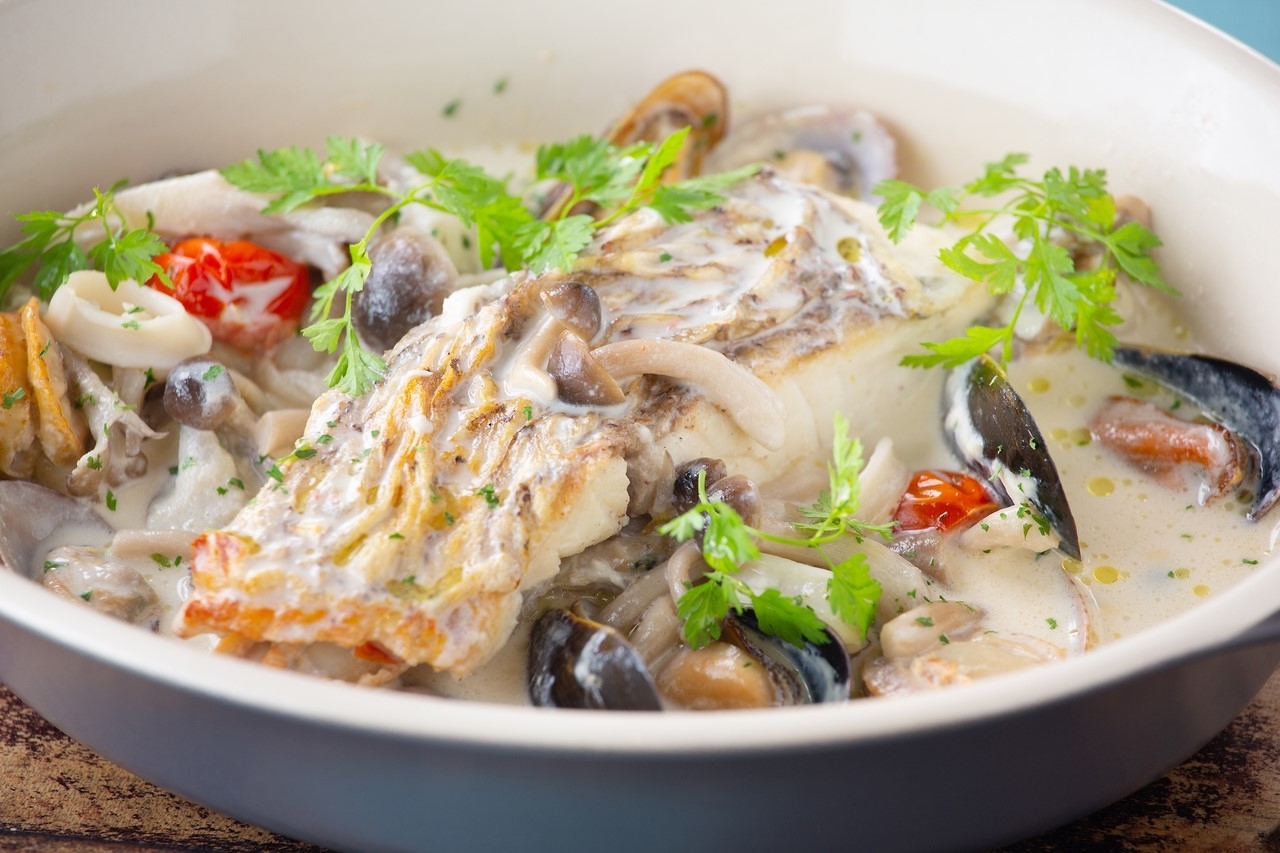 魚介類をトマトやオリーブオイルなどとともに煮込んだ料理。MouMou自慢の北海道生クリームを使用し、濃厚に仕上げた自慢のクリーム料理です。