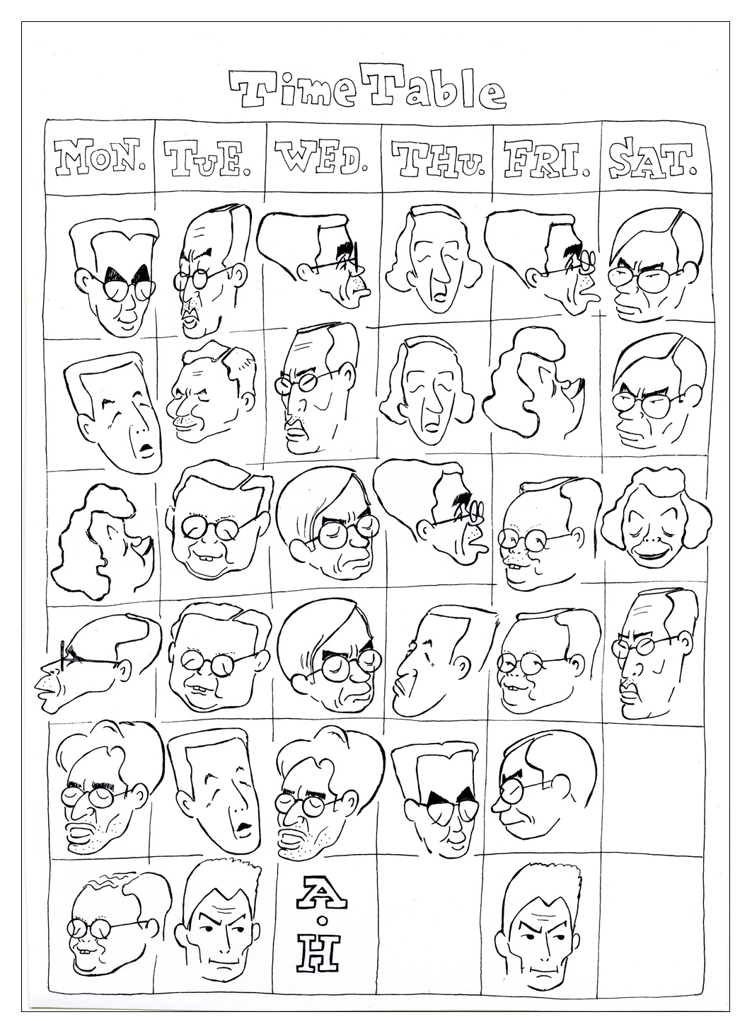 和田さんが高校2年生の頃に作った先生の似顔による時間割表〈1953年〉