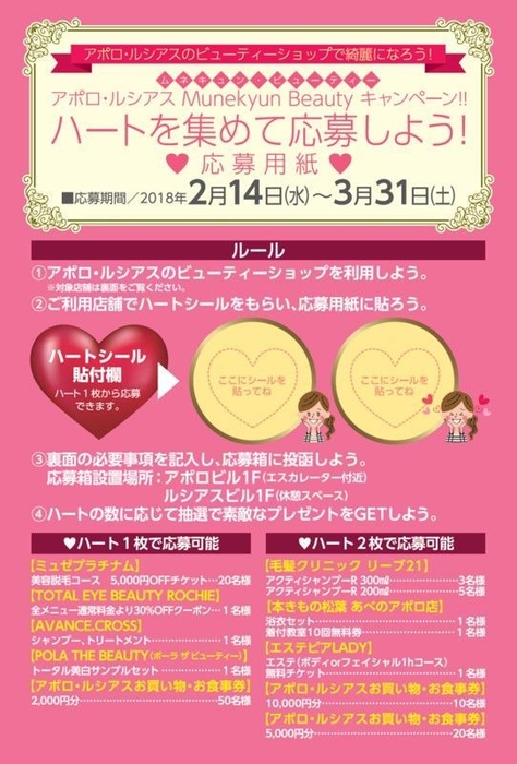 ネスなどのビューティー系ショップが一堂に会しコラボするキャンペーン「アポロ・ルシアスのビューティーショップで綺麗になろう!アポロ・ルシアス Munekyun Beauty キャンペーン!!」を本年2月14日(水)から3月31日(土)まで開催しますのでお知らせ致します。