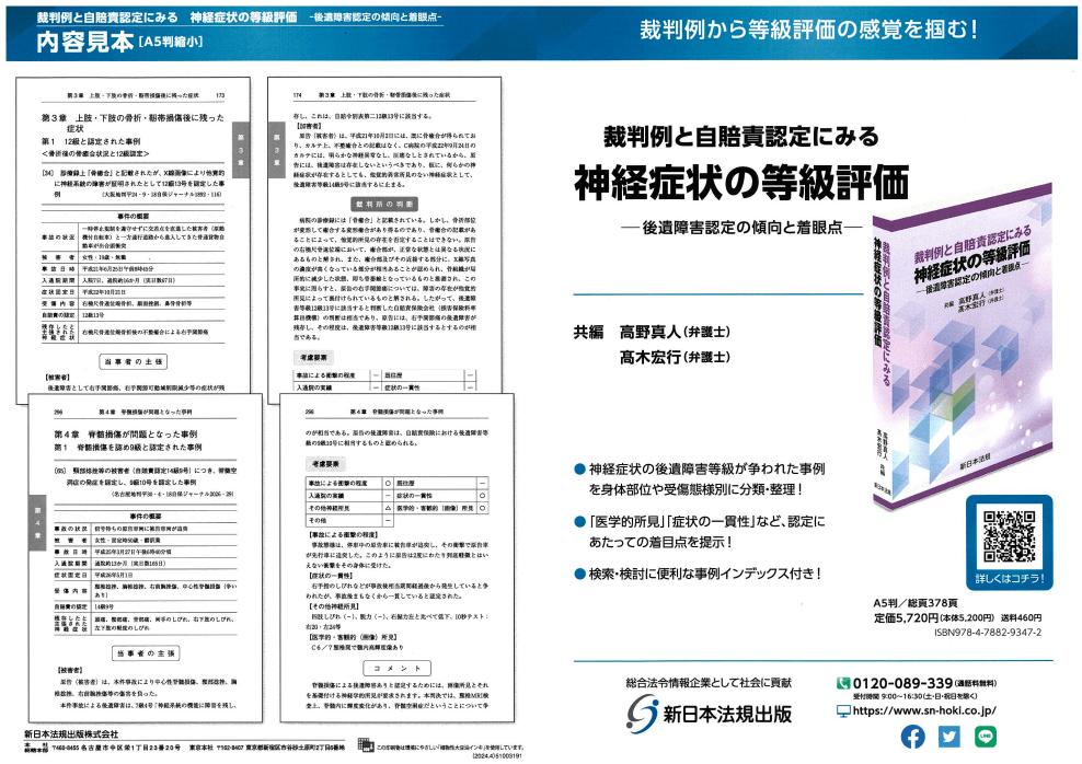 新日本法規出版株式会社(所在地:愛知県名古屋市中区栄1丁目23番20号、代表取締役:星謙一郎 (https://www.sn-hoki.co.jp/))は、「裁判例と自賠責認定にみる 神経症状の等級評価-後遺障害認定の傾向と着眼点-」を2024年4月22日に発売いたしました!