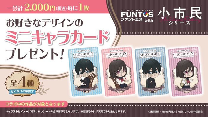 カフェ・グッズコーナーにて一会計2,000円(税込)毎に1枚、お好きなデザインのミニキャラカード(全4種)を1枚プレゼントいたします。