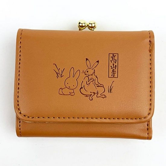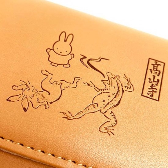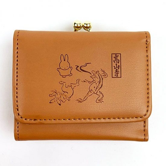 キャメルカラーが上品でシックな、コンパクト財布です。表面には、ミッフィーと鳥獣戯画のデザインが。