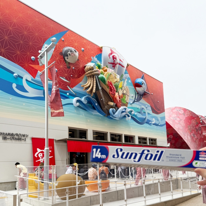 赤と青のコントラストが眩しい、立体的な日本の食のイメージがデザインされた建物です。