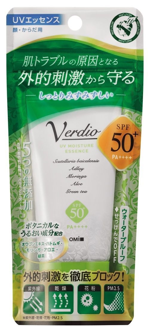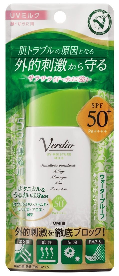 『ベルディオ』シリーズは、5つのボタニカルなうるおい成分:ハトムギエキス、モリンガエキス、オウゴンエキス、アロエエキス、緑茶エキスを配合しており、化粧下地にも最適で肌にしっかりとうるおいを与えます。汗・水にも強いウォータープルーフタイプですが、せっけんや洗顔料、ボディソープで手軽に落とせます。クレンジング要らずなのでお肌に負担をかけず、年間を通して顔・からだに使用でき、日常紫外線からお肌を守ります。